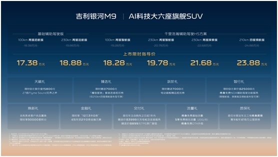 9月17日,吉利银河M9在杭州正式上市,上市限时指导价为17.38万-23.88万元,相比于预售价格,其6款车型的上市价格均下降2万元。作为银河品牌的旗舰车型,预售成绩不俗的M9,上市价格进一步下探,也凸显出吉利银河对其寄予的厚望。
