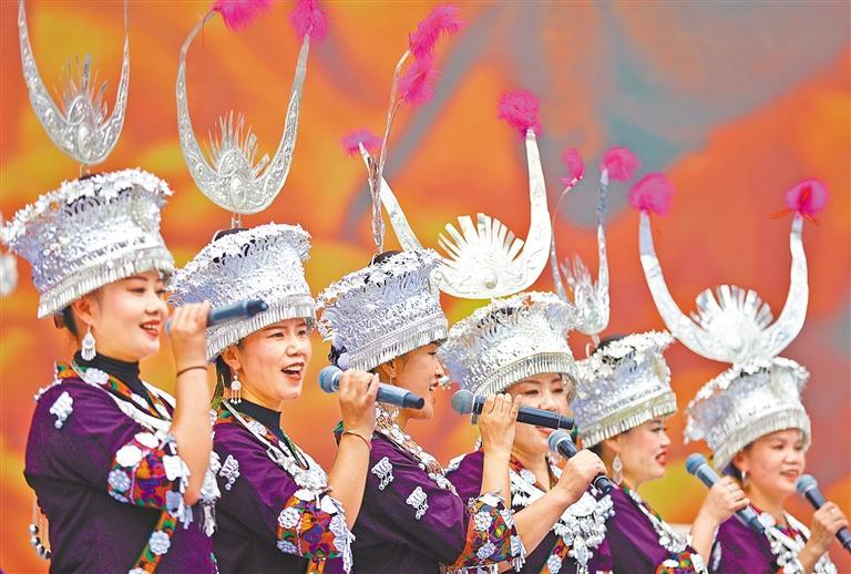 10月1日,重庆市彭水苗族土家族自治县蚩尤九黎城景区,演员在表演独具苗乡特色的歌舞节目。赵 勇摄(中经视觉)