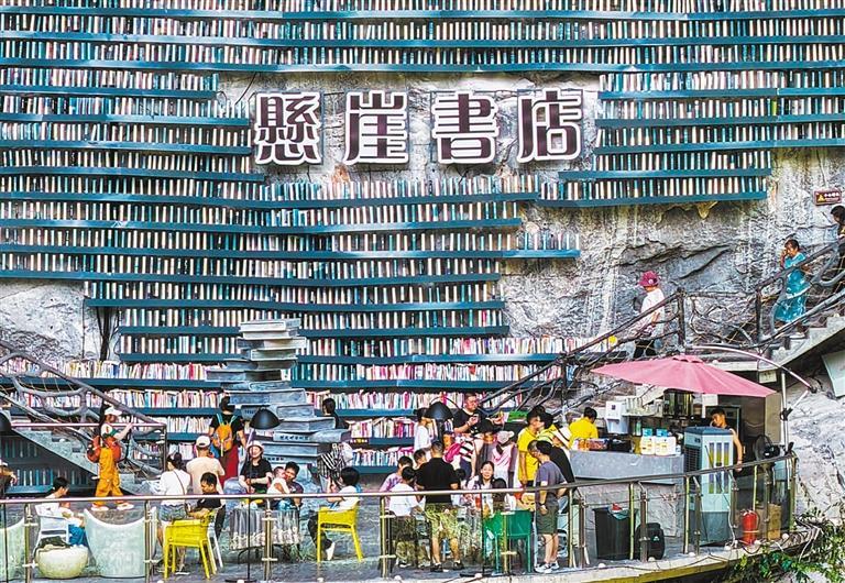 10月2日,位于广西壮族自治区河池市罗城仫佬族自治县棉花天坑景区内的悬崖书店吸引了众多游客。蒋克青摄(中经视觉)