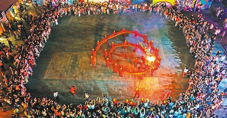 10月5日,安徽省芜湖市镜湖区芜湖古城,游客在观赏国家级非遗徽州板凳龙巡游展演。王玉实摄(中经视觉)