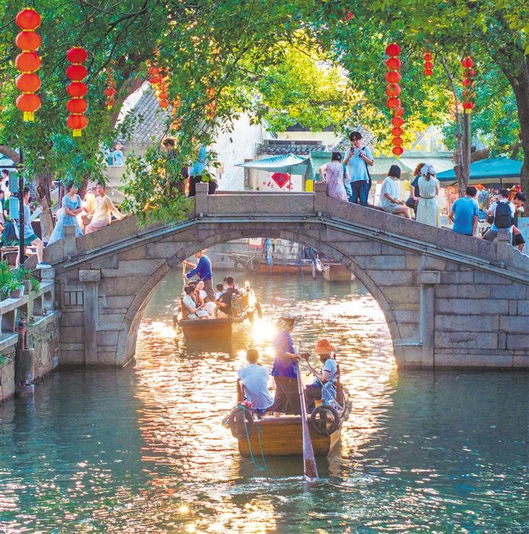 10月6日,江苏省苏州市吴江区同里古镇,游客乘坐摇橹船游览。周社根摄(中经视觉)