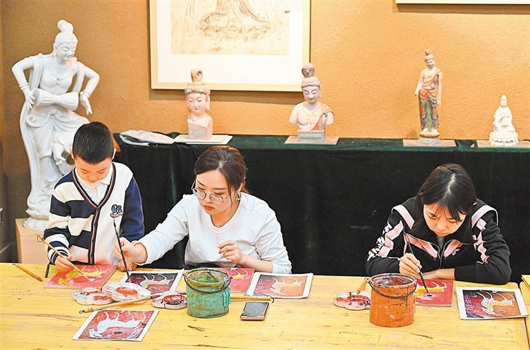 10月6日,游客在甘肃省敦煌小镇莫高山美术馆研学课堂临摹敦煌壁画,感受传统文化魅力。张晓亮摄(中经视觉)