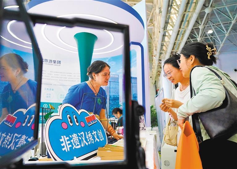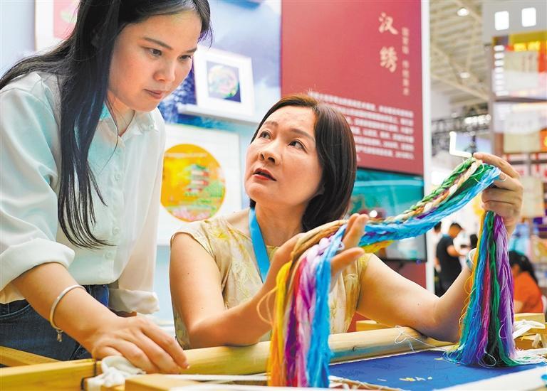 9月12日,在武汉举行的2025中国文化旅游产业博览会现场,汉绣非遗代表性传承人石玉香(左)为观众介绍汉绣文创作品。