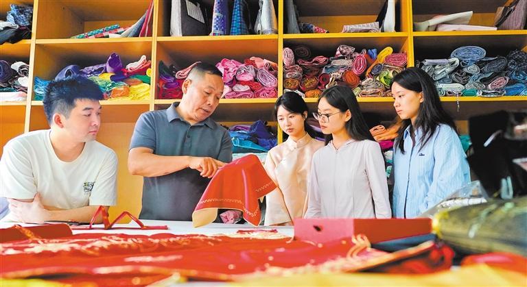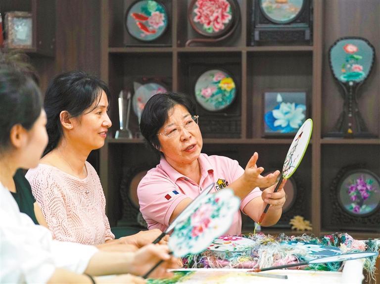 9月14日,汉绣省级代表性传承人王子怡(右一)向学生介绍刺绣针法。她长期研究汉绣荆楚地域文化艺术风格,不断创新汉绣教学模式。