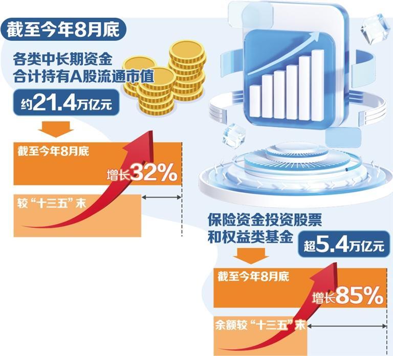 截至今年8月底,各类中长期资金合计持有A股流通市值约21.4万亿元,较“十三五”末增长32%;保险资金投资股票和权益类基金超5.4万亿元,余额较“十三五”末增长85%……“十四五”期间,特别是去年9月份以来,中长期资金入市规模持续提升,助力资本市场稳定健康发展。