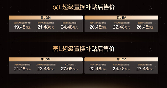 据介绍,汉L EV、唐L EV搭载超级e平台全域千伏架构,以“兆瓦闪充 油电同速”,有效解决纯电补能焦虑;汉L DM、唐L DM标配第五代DM技术,兼顾超强性能与超级效能。此外,汉L唐L全新解锁“车位到车位”领航辅助功能,并带来全新车色、智慧生态与安全配置的全面升级。