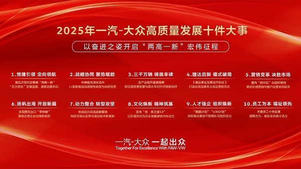 汽车市场竞争加剧的当下,一汽-大众何以敢为人先,答案或许就藏在2025年“十件大事”里。今日,一汽-大众发布2025年高质量发展“十件大事”,包括党建引领,定向领航;战略协同,聚势赋能;三千万辆,铸就丰碑;捷达启新,模式破局;营销变革,决胜市场;扬帆出海,开放新篇;动力整合,转型攻坚;文化焕新,精神筑基;人才强企,组织焕新;员工为本,福祉领先。