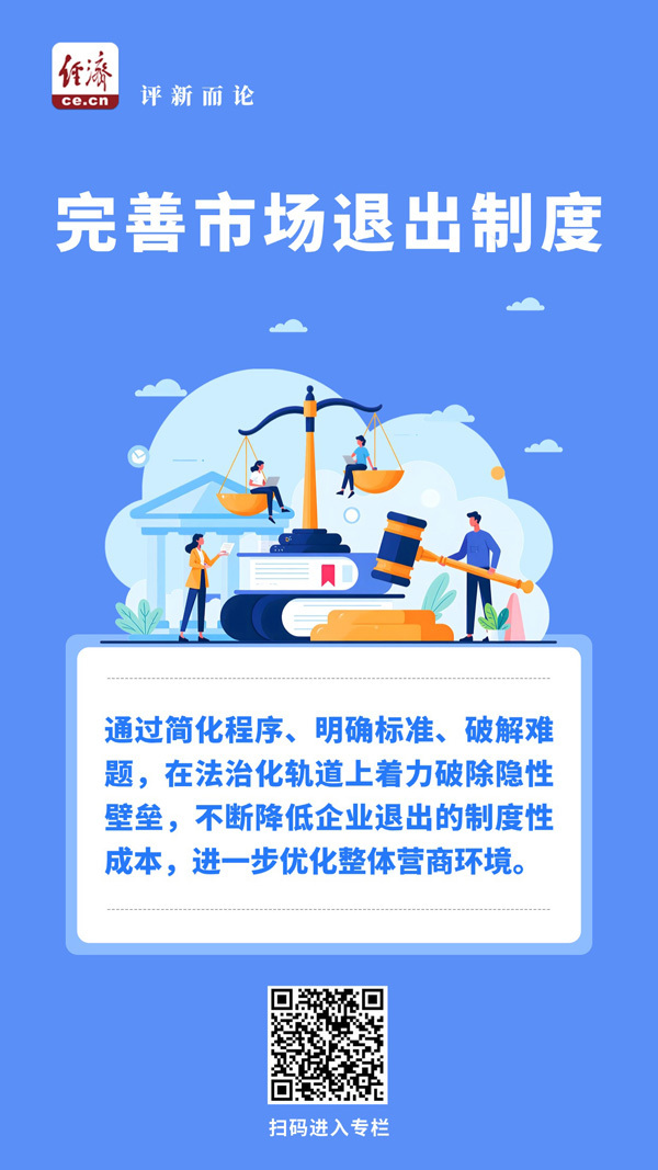 市场退出制度是现代化经济体系的重要组成部分。从党的二十届三中全会《决定》到“十五五”规划建议,党中央大政方针的部署安排,为加快完善高效有序的退出制度提供了遵循。这对于激发经营主体竞争活力、完善优胜劣汰的市场机制,乃至加快建设全国统一大市场,无疑具有重要意义。