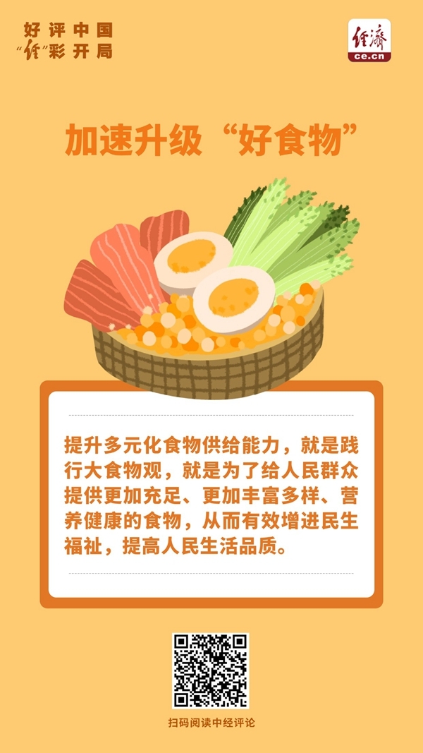 从森林到草原,从山区到海边,提升多元化食物供给能力,就是践行大食物观,就是为了给人民群众提供更加充足、更加丰富多样、营养健康的食物,从而有效增进民生福祉,提高人民生活品质。接下来,持续优化食物供给体系,盘活多元化食物供给资源,“中国饭碗”将端得更牢,国民餐桌上的“好食物”也将加速迭代升级。(中国经济网评论员 臧梦雅)