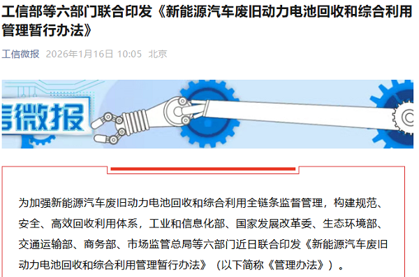 中国经济网1月16日讯(记者 姜智文)今日,工业和信息化部等六部门联合发布《新能源汽车废旧动力电池回收和综合利用管理暂行办法》(以下简称“管理办法”),提出遵循“全渠道、全链条、全生命周期”的管理思路,涵盖重点设计“车电一体报废”、建立新能源汽车动力电池数字身份证管理制度等。新规自2026年4月1日起施行。