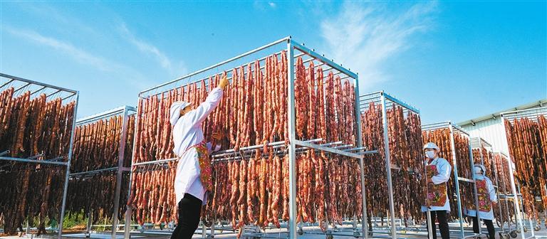 1月15日,四川省德阳市旌阳区妈仔食品有限责任公司晒场,员工在晾晒腊肠、腊肉、腊排等传统特色腊制品。唐渝川摄(中经视觉)