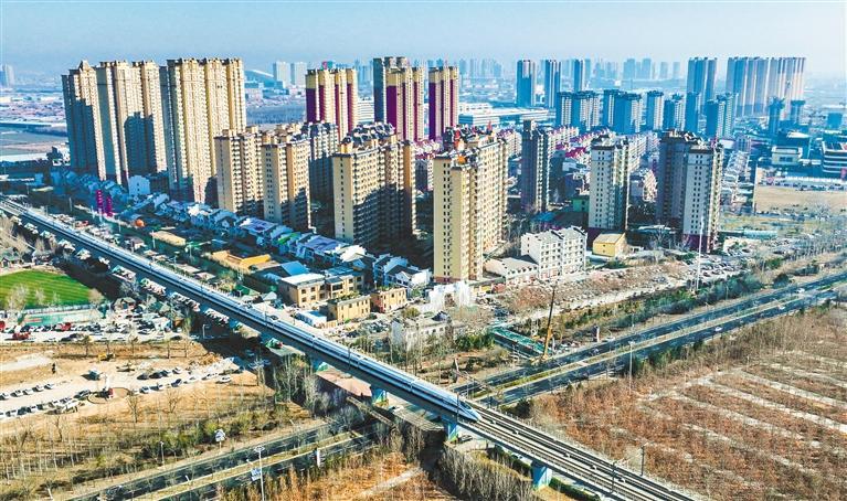 2月1日,一列动车组从塔元庄村旁驶过,村内楼房成行连片。石家庄日报记者梁子栋 摄