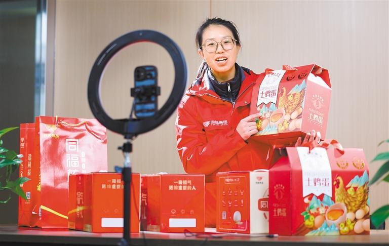 2月1日,塔元庄村文产电商直播实训基地,工作人员在直播推介当地农产品。塔元庄村与本地企业合作创建品牌,精选产品、统一包装,提升农副产品附加值。石家庄日报记者梁子栋 摄