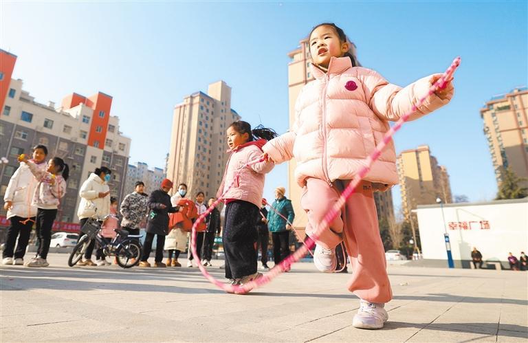 2月1日,小朋友们在塔元庄村幸福广场跳绳。石家庄日报记者梁子栋 摄