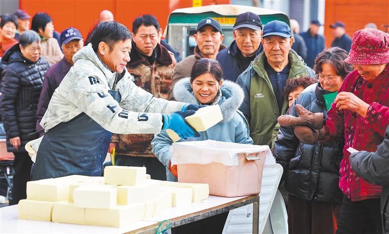 2月5日,塔元庄村村民在领取免费的年货豆腐。春节临近,塔元庄村举办年货大集、送春联等活动,为村民送上新春祝福。石家庄日报记者梁子栋 摄