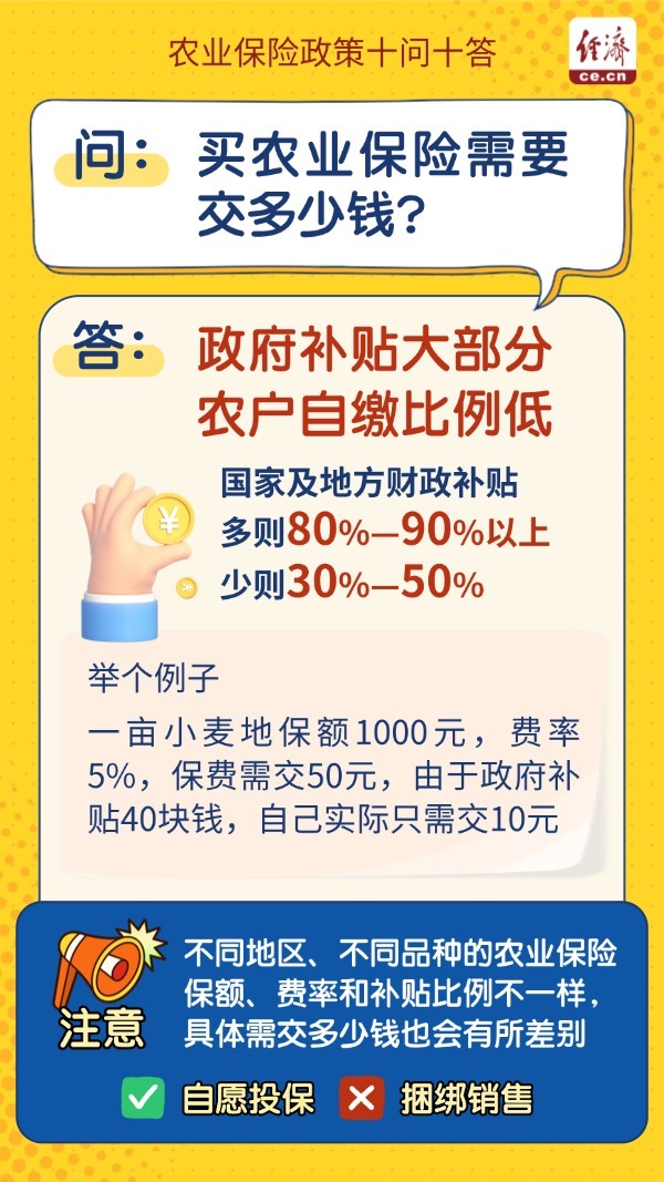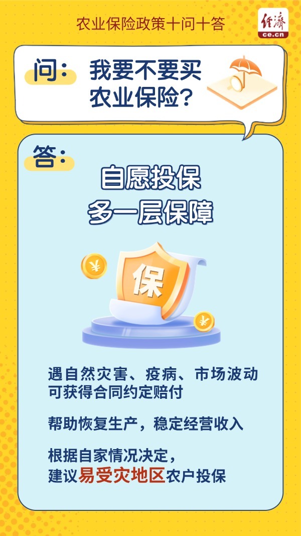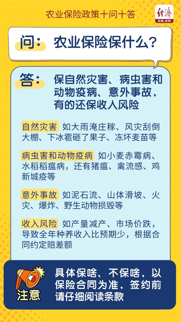 编者按:农业保险是国家保障粮食安全、稳定农业生产的重要政策工具。近年来,适度规模种养模式持续推广,广大农民积极参与响应,对农业保险的需求日益迫切。近日,农业农村部联合财政部、金融监管总局有关司局,整理编制了农业保险政策十问十答。一组海报带你了解农业保险的相关政策。