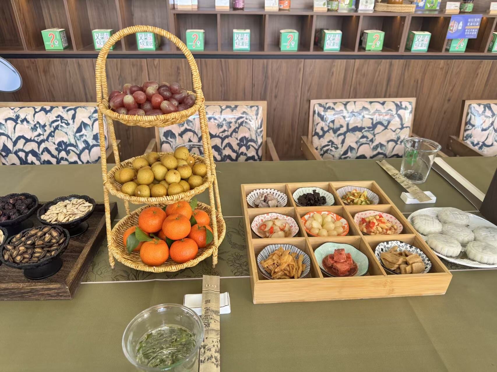 咸菜、糯米饼、水果依次摆放,刚沏好的惠明茶香气四溢。夹一筷子咸菜,再就一口绿茶,酸甜鲜香在口中散开,畲乡版“乡村下午茶”让人印象深刻。