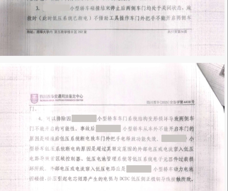 根据第一财经获悉的《司法鉴定意见书》内容,关键信息如下:事故车无法从车外打开车门,并非因车门系统结构变形损坏所致,而是碰撞后低压系统断电致车门外把手电释放功能失效。同时,当事人系车辆起火燃烧导致火烧死亡,而非车辆碰撞直接导致死亡。