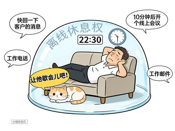 “睁开眼有几十条工作群信息跳出来”“半夜接到微信通知处理紧急事务”“下班拿着笔记本电脑回家继续赶材料”……这些场景已成为数智时代不少职场人的日常。近期,“离线休息权”引发网友热议。“随时在线”不该被默认为劳动者义务,守住生活边界,让休息不再是奢望。(图文/彭章霞)
