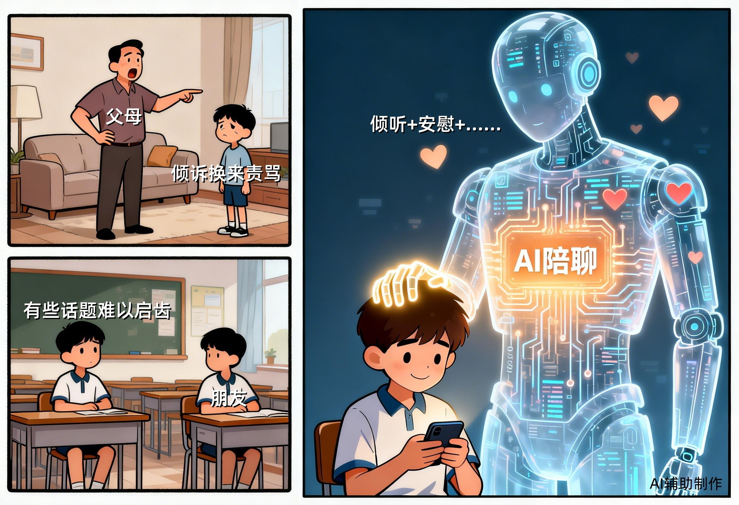 “上学压力大,家人不理解自己,倾诉换来责骂;朋友间有些话题又难以启齿。”一名初一学生道出心里的苦闷。在社交平台,也有部分青少年表示,“有极端情绪时会玩AI聊天,好歹比真人会安慰我,让我好好哭一场。”某种程度上,AI陪聊提供的“无评判倾听”与“心理慰藉”,成了青少年宣泄情绪的出口。而这种“完美”的陪伴,恰恰折射出真实情感陪伴的缺位。或许,孩子沉迷的并非技术,而是现实中稀缺的理解与接纳。(图文/李冬阳)