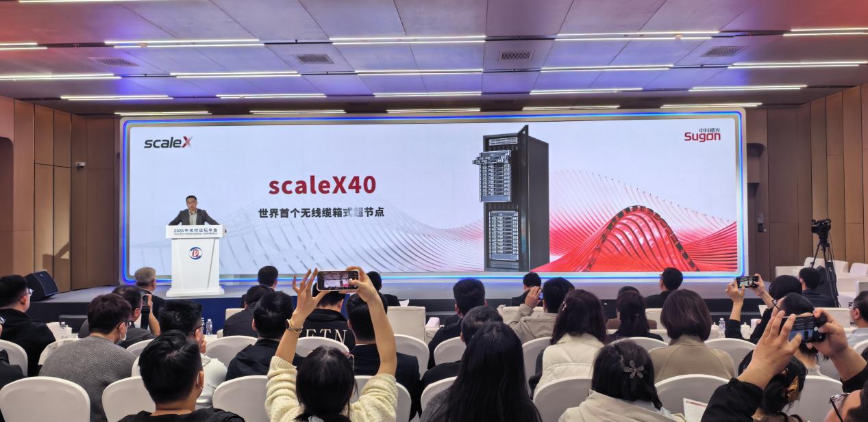 3月26日,中科曙光在2026中关村论坛年会现场发布世界首个无线缆箱式超节点scaleX40。