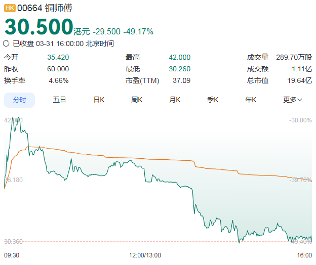 首日开盘即破发,铜师傅每股定价60港元,上市首日开盘报35.42港元,较发行价低开40.97%。截至今日收盘,铜师傅股价报30.05港元/股,跌49.17%。