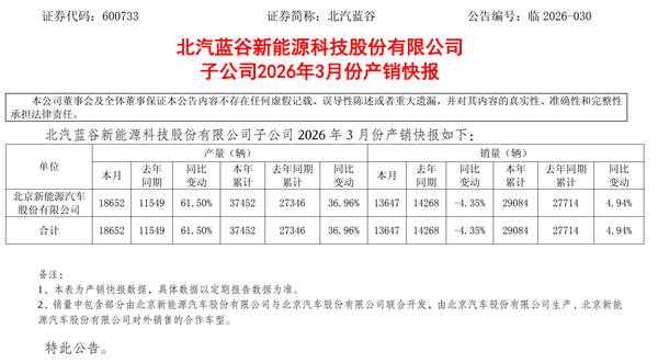 中国经济网4月1日讯(记者 姜智文)今日,北汽蓝谷发布数据显示,公司3月销量13647辆,环比增长85%;一季度累计销量29084辆,同比增长4.94%。从高端突破到产能扩容,从产品焕新到海外启航,北汽蓝谷正以“享界+极狐”的双轮驱动,驶入增长快车道。