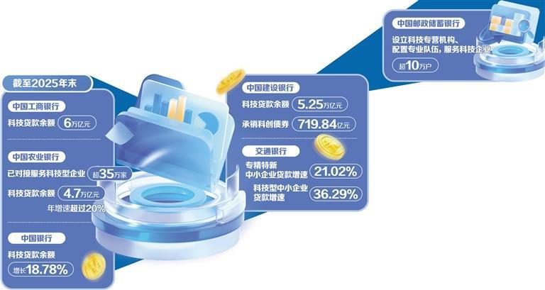 国有大型商业银行表现如何?年报显示,截至2025年末,中国工商银行的科技贷款余额已达到6万亿元;中国农业银行已对接服务科技型企业超35万家,科技贷款余额4.7万亿元,年增速超过20%;中国银行率先发布支持人工智能产业链发展行动方案,科技贷款余额增长18.78%;中国建设银行科技贷款余额5.25万亿元,承销科创债券719.84亿元,累计设立28只金融资产投资公司(AIC)股权投资试点基金;交通银行专精特新中小企业贷款、科技型中小企业贷款增速分别高达21.02%和36.29%;中国邮政储蓄银行设立科技专营机构、配置专业队伍,服务科技企业超10万户。