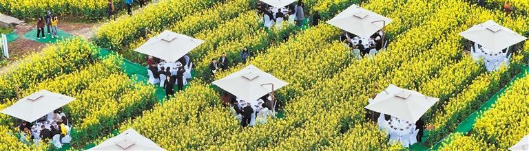 3月13日,游客在四川省南充市蓬安县睦坝镇武胜村油菜花田品尝“花田席”。刘永红摄(中经视觉)