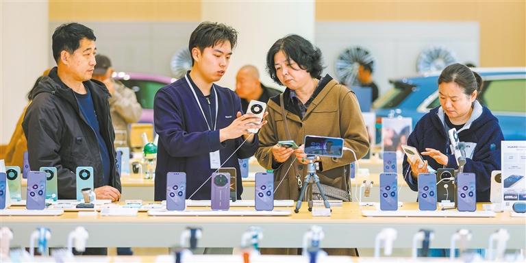 3月25日,山东省青岛市乐客城华为智能生活馆,消费者在选购手机等“国补”产品。张 鹰摄(中经视觉)