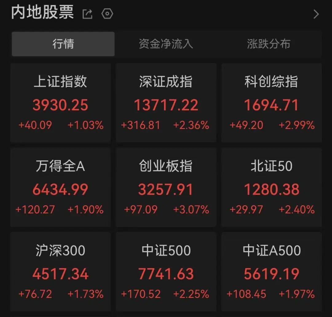 8日A股开盘,三大指数集体高开,沪指涨1.03%,深证成指涨2.36%,创业板指涨3.07%。盘面上,有色、半导体、通信设备、元器件等板块涨幅居前。
