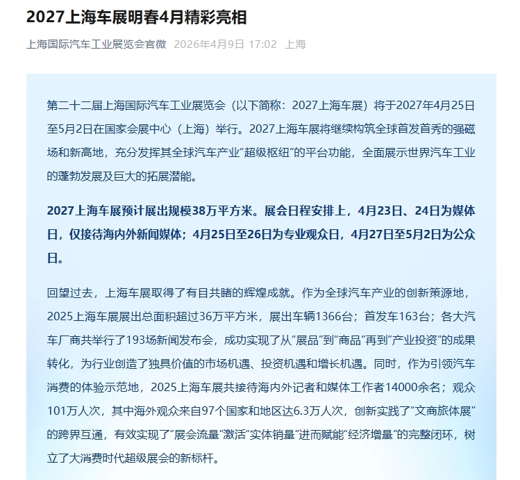 在展出规模上,2027上海车展预计将达到38万平方米。展会日程安排上,2027年4月23日、24日为媒体日,仅接待海内外新闻媒体;4月25日至26日为专业观众日,4月27日至5月2日为公众日。