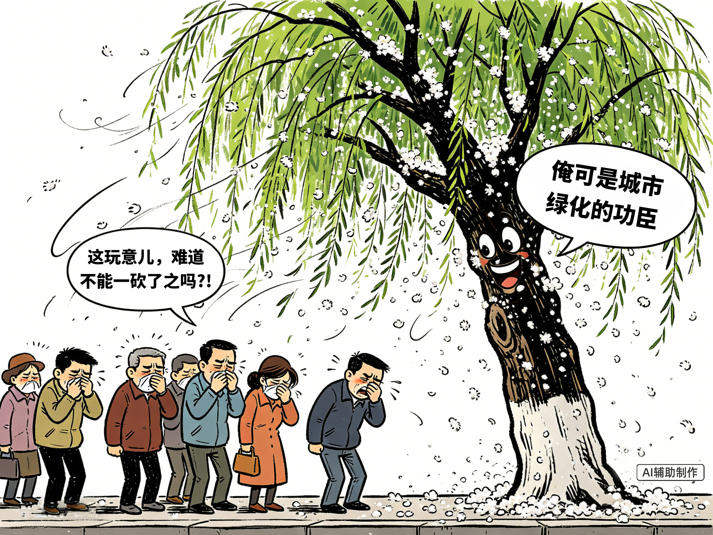 近期,北方多地杨柳飞絮扰民严重,不少人呼吁砍树。杨柳树是三四十年的生态功臣,若遭“一砍了之”会造成水土保持等功能长期缺失,并不现实。飞絮问题本质是发展中的两难矛盾,不能简单粗暴解决。当前各地正通过更换雄株、嫁接、抑花药物科学治理。治理飞絮急不得、停不得,既要精准施策、久久为功,也需群众共同参与,在发展中平衡民生与生态。(图文/彭章霞)