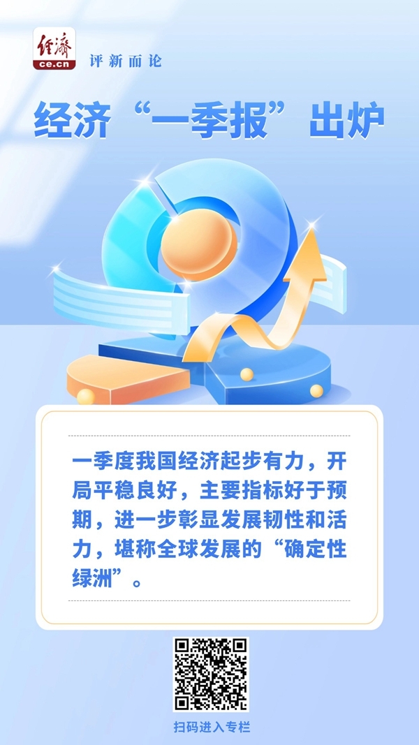 一季度我国经济起步有力,开局平稳良好,主要指标好于预期,进一步彰显发展韧性和活力,堪称全球发展的“确定性绿洲”。一季度,国内生产总值同比增长5.0%,比去年四季度大幅回升0.5个百分点,达到今年全年“4.5%—5%”发展预期目标区间高线。复杂多变的外部冲击面前,这份成绩来之不易,更为完成全年目标奠定坚实基础、注入坚定信心。