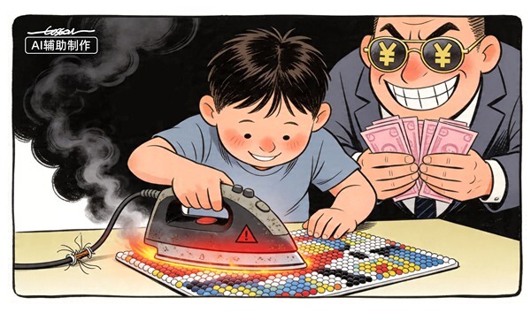 近期,“拼豆热”悄然兴起,然而热潮背后隐患重重。“拼豆”质量参差不齐,熨烫环节中电熨斗起火、触电等安全事故频频发生。商家为逐利漠视安全,监管也存有盲区,让本该带来快乐的玩具,变成了威胁儿童安全的“烫手山芋”。必须筑牢安全防线,别让利益灼伤了孩子。(图文/张博森)