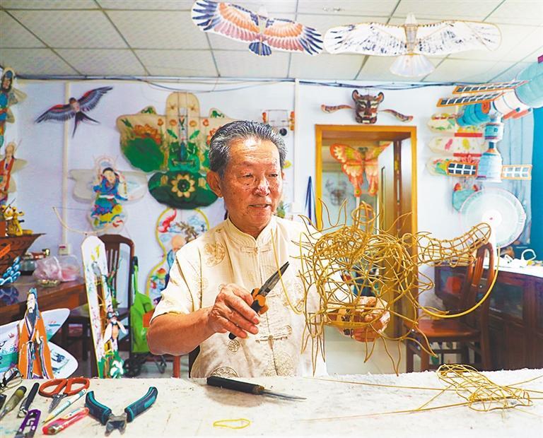 4月17日,国家级非物质文化遗产项目风筝制作技术(潍坊风筝)代表性传承人张效东在扎制龙头蜈蚣风筝骨架。刘祥辉摄(中经视觉)