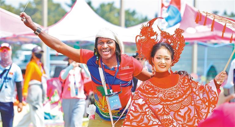 4月18日,第43届潍坊国际风筝会现场,外国风筝放飞选手与身着剪纸主题服饰的表演者合影。袁彦奎摄(中经视觉)