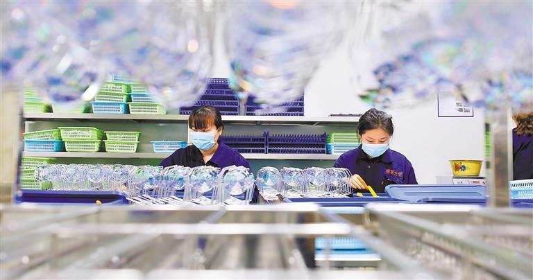 4月18日,安徽省淮北市濉溪经济开发区一光学科技企业,工人在生产出口玻璃镜片。
