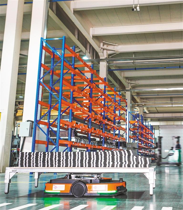 4月20日,河南省洛阳市庞村镇洛阳花都家具集团有限公司智能生产区,AGV运输小车有序作业,赶制一批出口海外钢制家具。