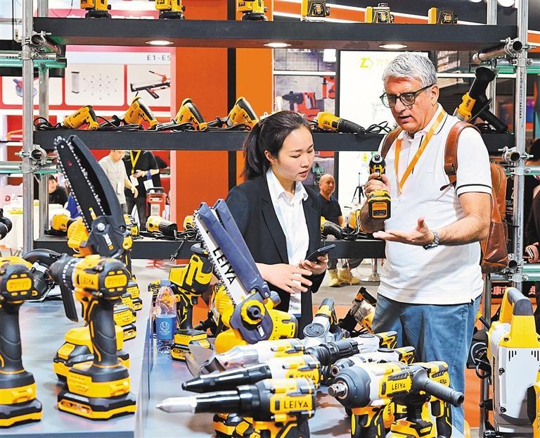 4月20日,浙江省金华市义乌国际博览中心,外商在第10届中国义乌国际五金电器博览会上洽谈采购业务。时补法摄(中经视觉)