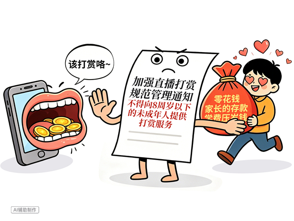 近年来,不少未成年人在平台和主播的诱导下冲动打赏,给家庭带来了沉重的经济负担。近日,中央网信办发布《关于加强网络直播打赏规范管理的通知》,明确提出,“网站平台不得向八周岁以下的未成年人提供打赏服务”。这一规定划清了行业底线,压实了平台责任,尤其将未成年人保护放在突出位置,为守护“数字童年”筑牢制度防线,彰显了网络空间治理的法治温度与责任担当。(图文/彭章霞)
