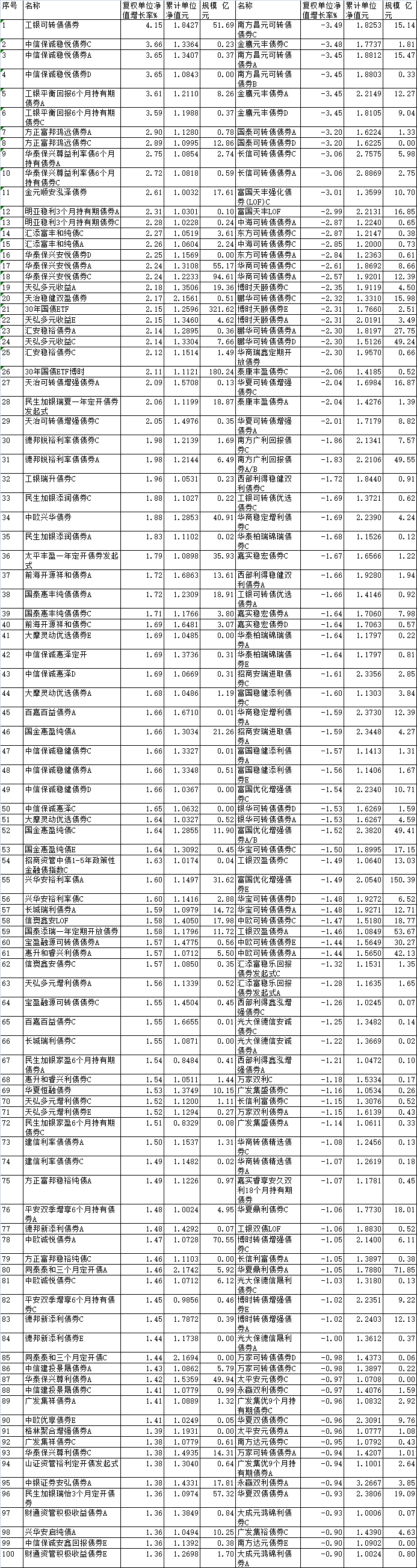 涨幅排名靠前的还有中信保诚稳悦债券C、中信保诚稳悦债券A、中信保诚稳悦债券D、方正富邦鸿远债券A、方正富邦鸿远债券C、华泰保兴尊益利率债6个月持有债券A、华泰保兴尊益利率债6个月持有债券C等债基,在10月份涨幅分别为3.66%、3.65%、3.65%、2.90%、2.89%、2.75%、2.72%。