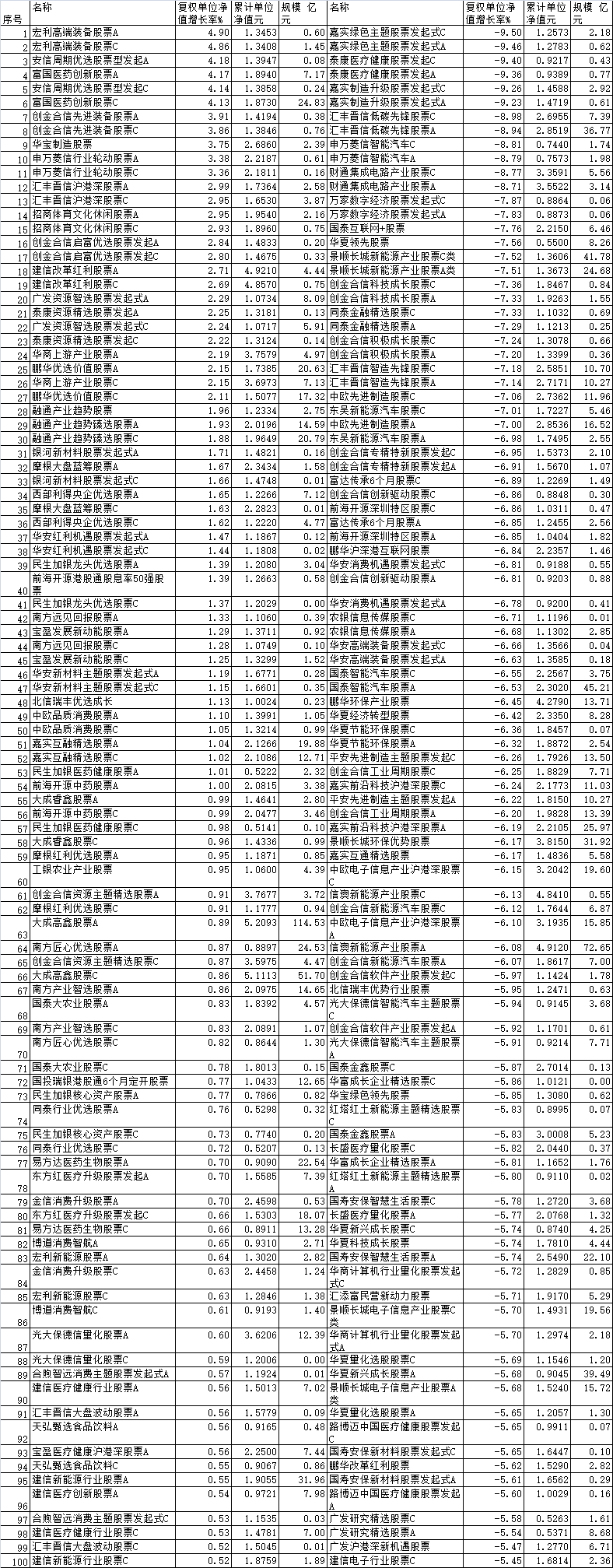 宏利高端装备股票A、宏利高端装备股票C、安信周期优选股票型发起A、富国医药创新股票A、安信周期优选股票型发起C、富国医药创新股票C成为上涨第一梯队,涨幅分别为4.90%、4.86%、4.18%、4.17%、4.14%、4.13%。