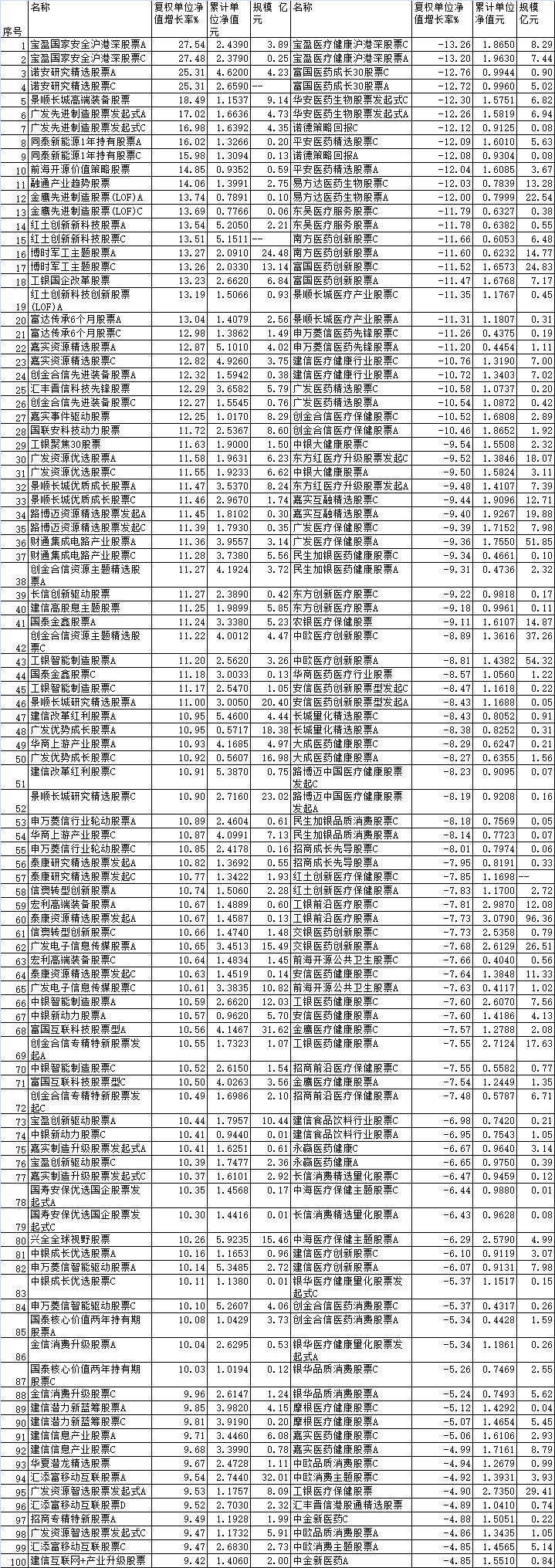 从涨幅榜看,宝盈国家安全沪港深股票A、宝盈国家安全沪港深股票C、诺安研究精选股票A、诺安研究精选股票C上涨均超过2成,成为领涨品种,分别上涨了27.54%、27.48%、25.31%、25.31%。