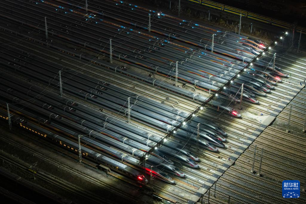 2月2日凌晨,检修完的动车组列车停靠在长沙动车运用所(无人机照片)。