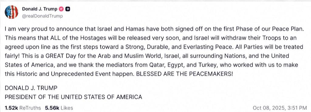 新华社北京10月9日电 美国东部时间8日傍晚,美国总统特朗普在社交媒体发文宣布,以色列和巴勒斯坦伊斯兰抵抗运动(哈马斯)已经同意美方所提“和平计划”的第一阶段。这意味着所有以方被扣押人员将很快获释,以色列军队也将撤回至双方商定的界线。