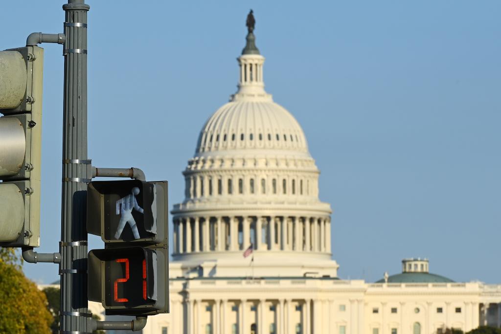 这是10月21日在美国华盛顿拍摄的国会大厦和交通信号灯。新华社记者李睿摄