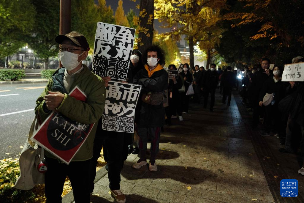 集会定于当地时间20时开始。19时前后,便有民众陆续赶到现场。抗议者们举着写有“撤回言论 反对战争”“因高市才有事”“高市下台”等标语的牌子,高喊“禁止军国主义复燃”等口号。多名抗议者要求高市对其涉台言论负责并辞去首相职务。