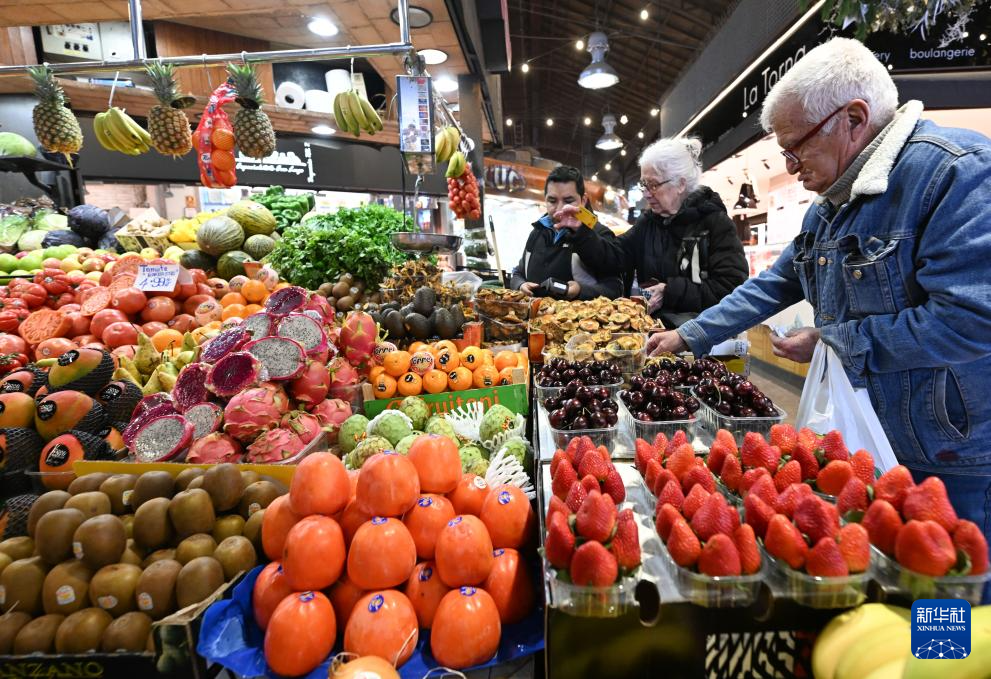 12月2日,顾客在西班牙巴塞罗那市中心的博凯里亚市场选购蔬果。欧盟统计局2日公布的初步统计数据显示,欧元区11月通胀率按年率计算为2.2%,高于10月的2.1%,继续保持在欧洲央行的中期目标水平之上。新华社记者 程敏 摄