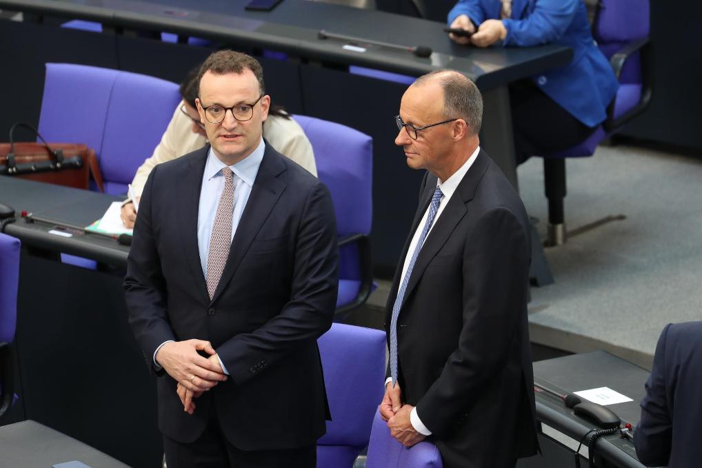 5月6日,在德国首都柏林的国会大厦,默茨(右)在第二轮投票议程中。新华社记者杜哲宇摄